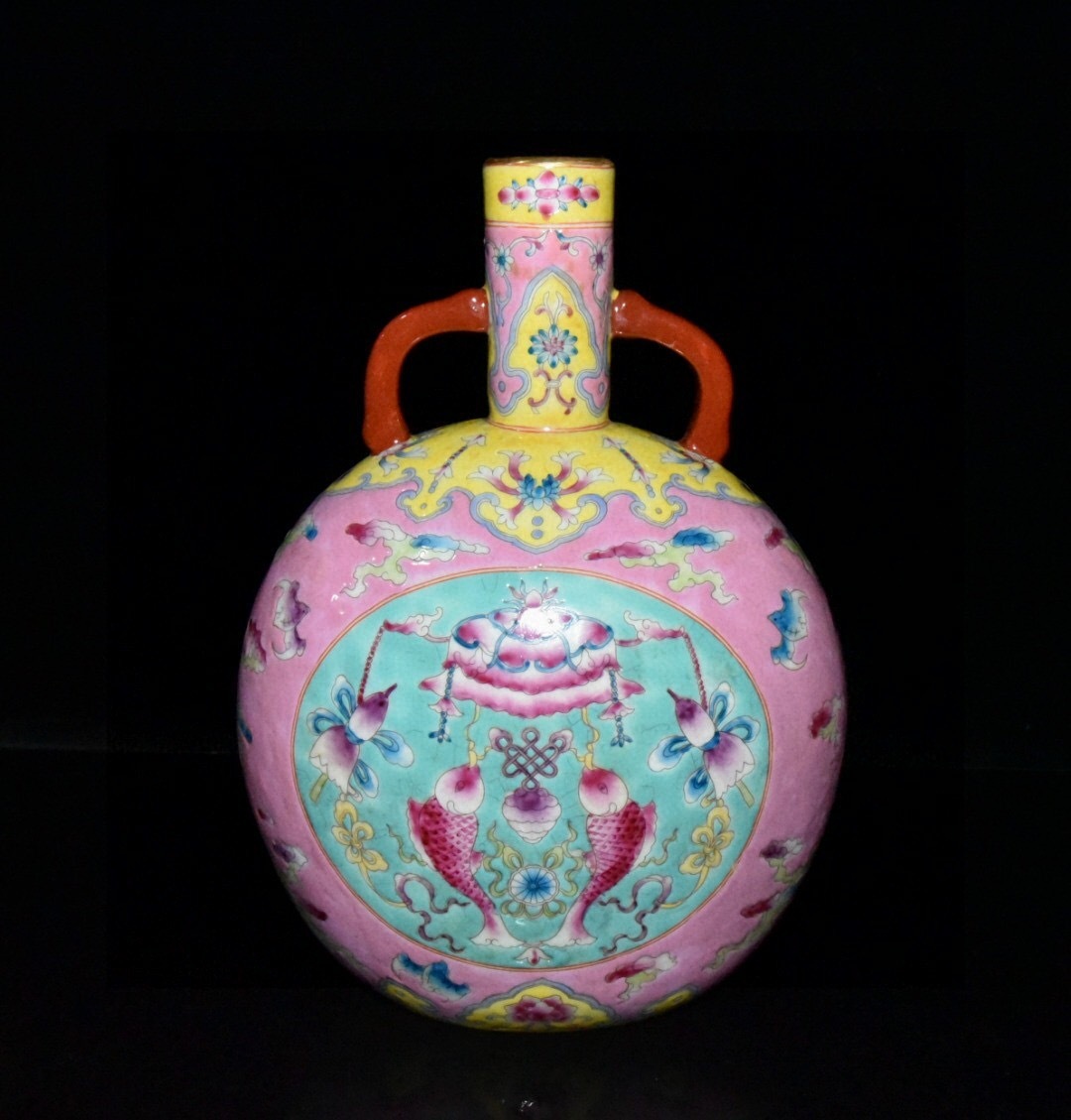 - ▽鴻▽ 清 雍正年製款 粉彩 開片 雙耳扁瓶 古陶瓷品 置物 古賞物 中国古玩 中国古美術