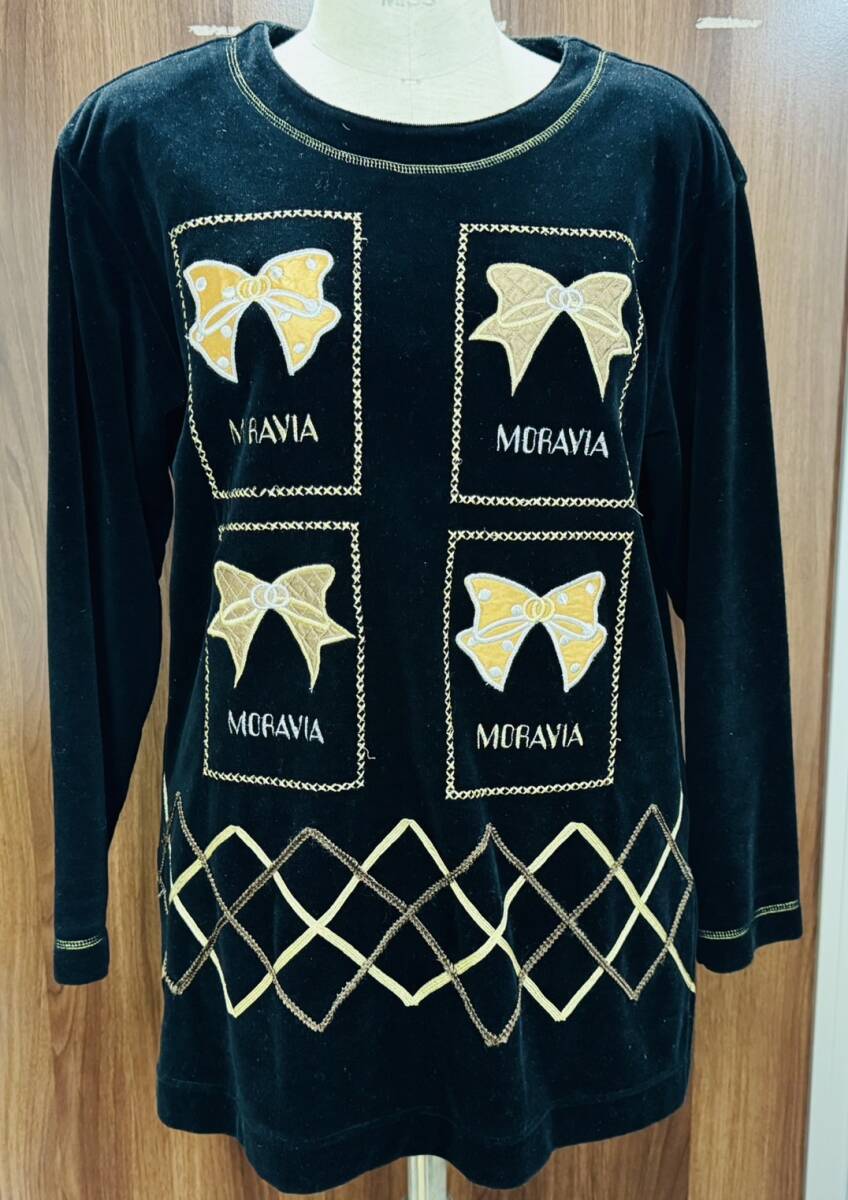 - 【現状品】~1円スタート~MORAVIA レディース ベルベット トップス リボン柄 長袖 黒 ブラック 肩幅48cm 身幅49cm 袖丈53cm 身丈73cm