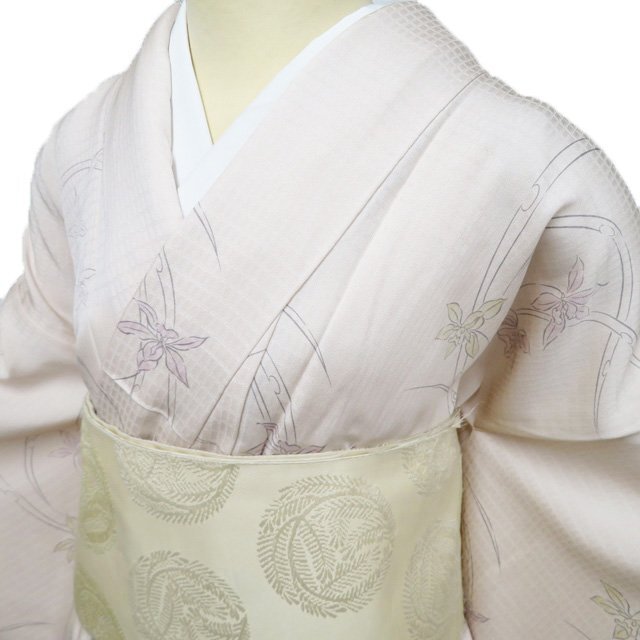 > 小紋 着物 中古 正絹 単衣 カジュアル 花模様 蘭 灰桜色 多色 身丈163.5cm 裄67cm L きもの北條 A1179-13