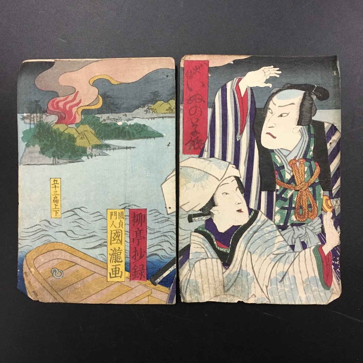 - 木版画 表紙『八犬伝 犬の草紙 53編 上下2枚続』 柳亭抄録 国滝 国貞門人 蔦吉 明治3 中本(12x18cm) 江戸時代 浮世絵 錦絵
