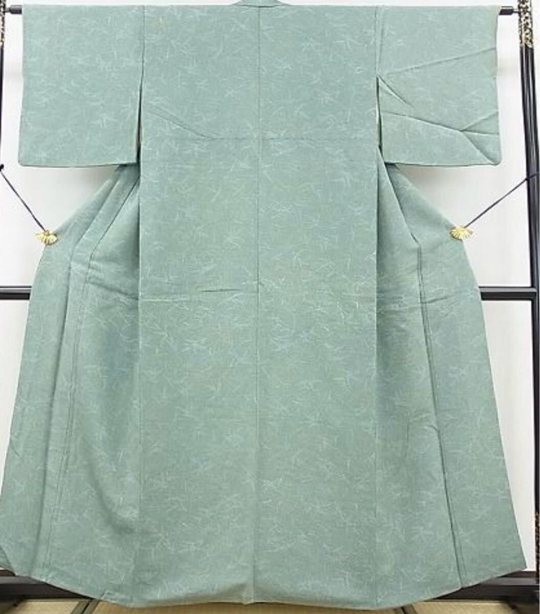 > 手引染 糸目 小紋 作家物 古代筒描染 草花文 端付き 袷 正絹 着物 グリーン系