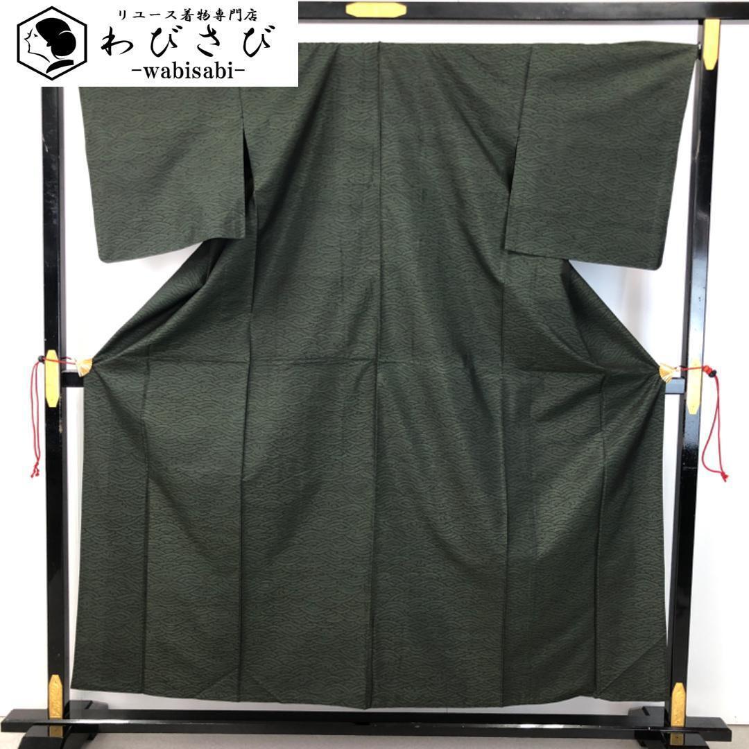 > 単衣 本場大島紬 横双絣 変わり青海波模様 木賊色 K-4604 着物 きもの kimono 和服 和装 中古 リサイクル着物 【送料無料】