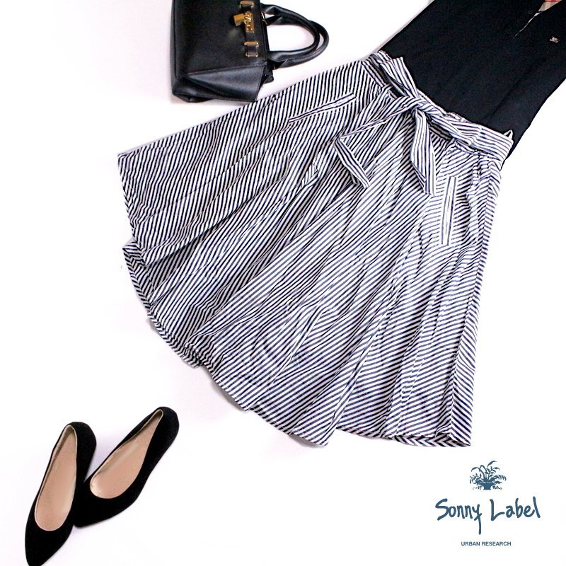 > 美品 サニーレーベル Sonny Label アーバンリサーチ 春 夏 ベルト付き ストライプ ボリューム フレアカート F ネイビー 紺 ホワイト 白