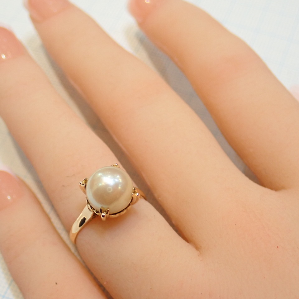 > ■K18 約8.7mm あこや真珠リング■アンティーク 昭和レトロ■穴透かし 割り爪■パール 本真珠 アコヤ■指輪■中古磨き仕上げ■
