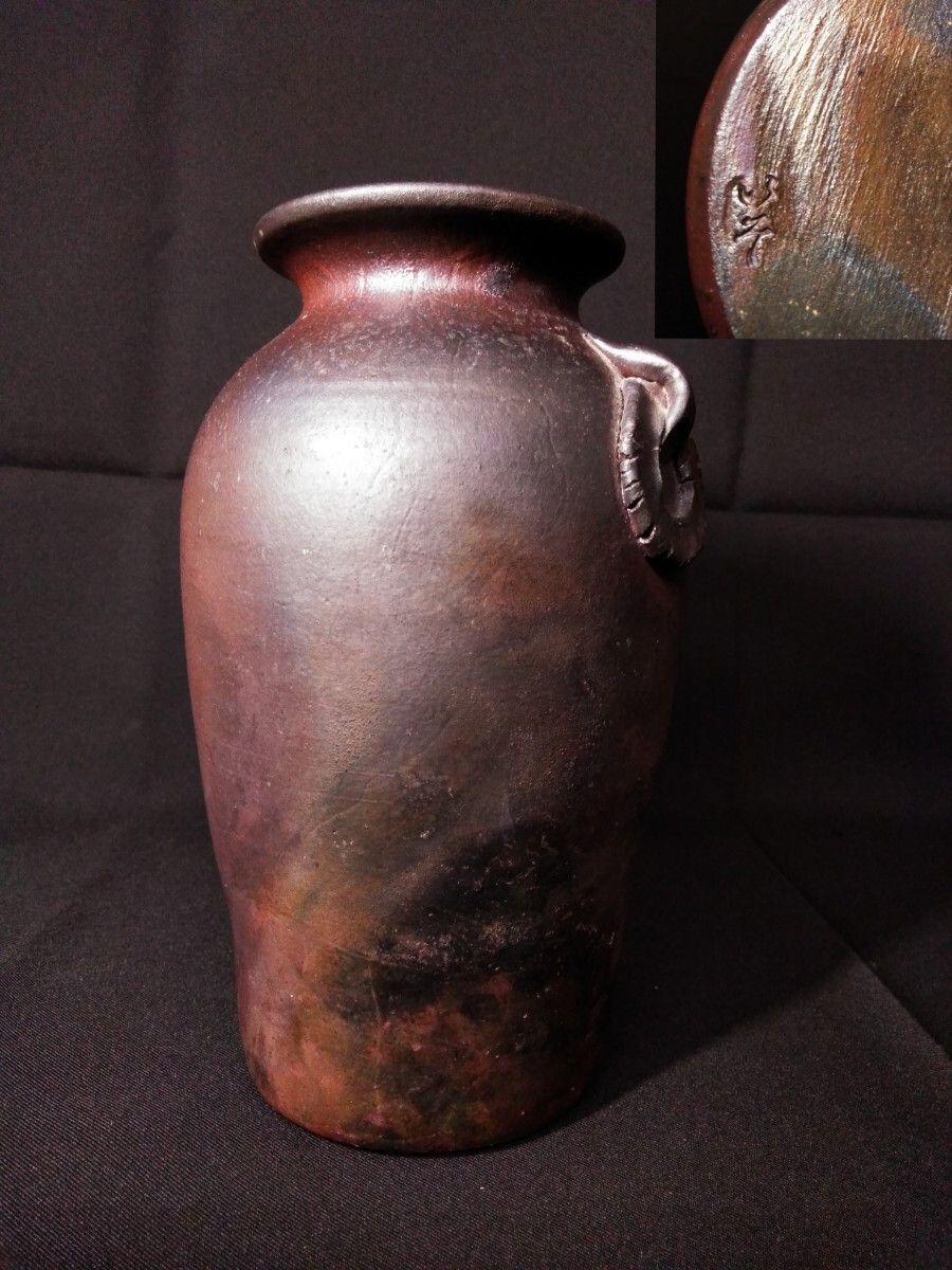 - 陶印 耳付 花器 花瓶 花入 インテリア 床間 床飾り (検索) 工芸 美術 陶器 華道具 茶道具 懐石 飾壷 アンティーク レトロ 和室 応接 生花