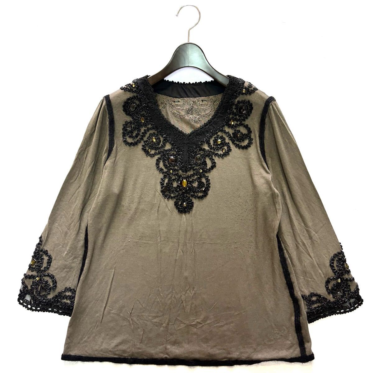 - V ◇ 良品/大きいサイズ!! '日本製' 伊太利屋 GK ITALIYA 7分袖 ビジュー装飾 レース ストレッチ チュニック カットソー 15号 トップス