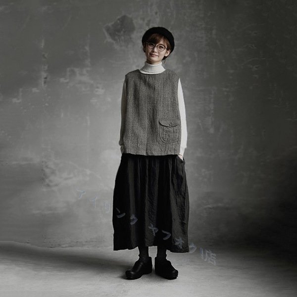 - 黒のコットン風ぷっくりスカートとグレーのツイードベストの2点セット大きいサイズもOKなフリーサイズかわいい