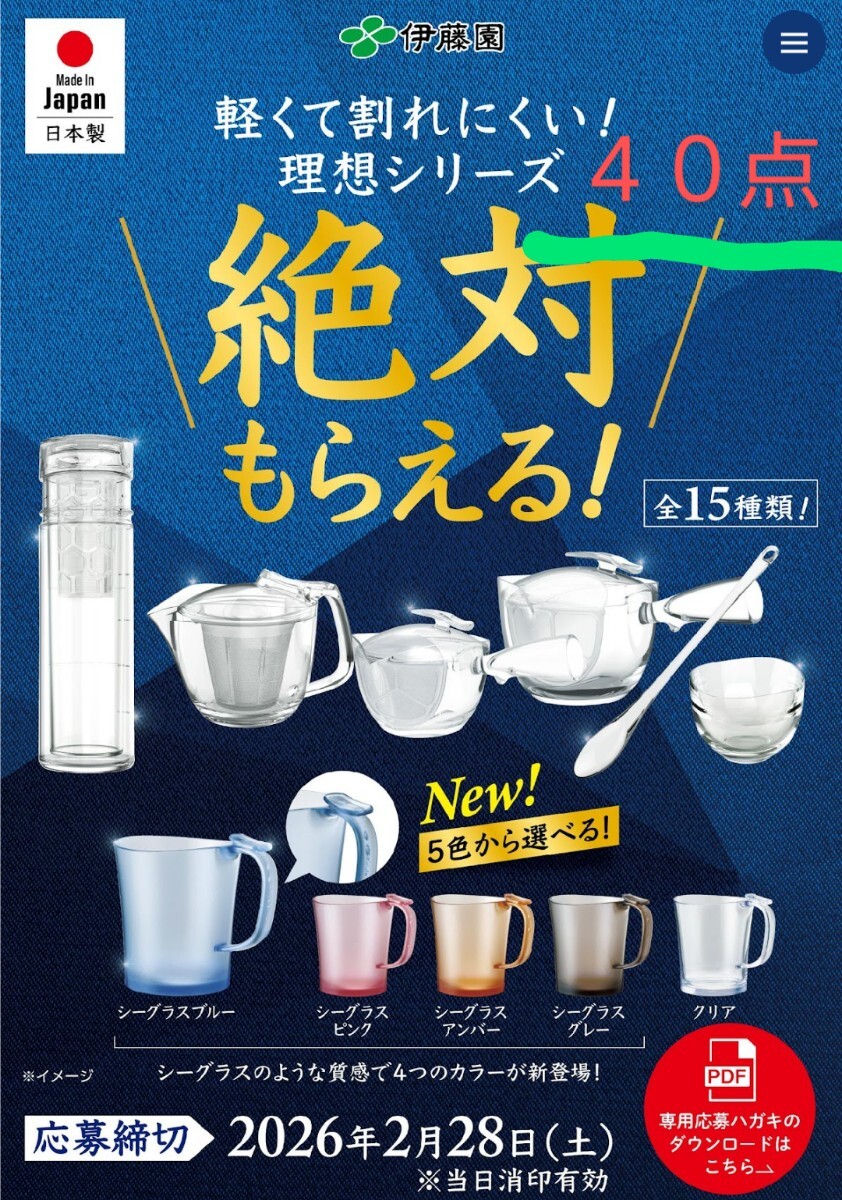 - 40点 伊藤園 絶対もらえる 理想の急須 理想のマイボトル マグ 湯のみ 懸賞応募 キャンペーン 2025~2026 パッキン ポイント応募券 ①