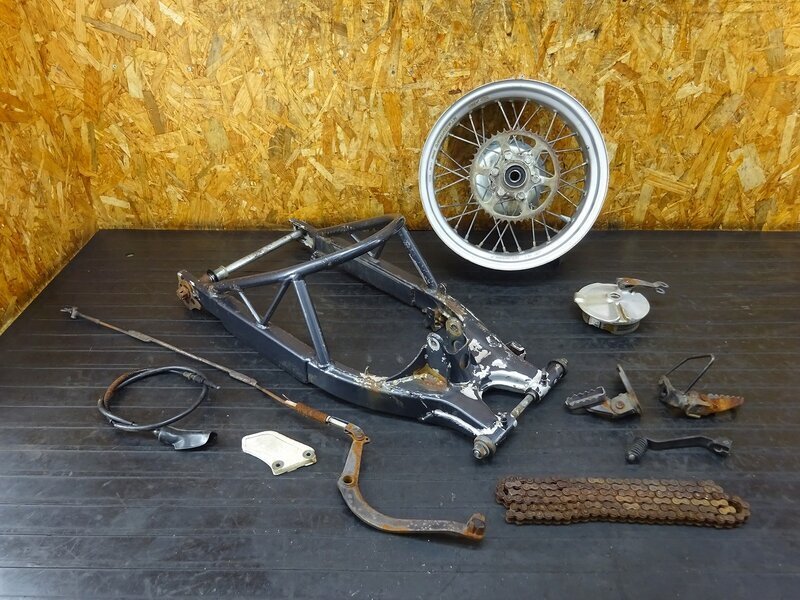 - 【250431】TW200(2JL-042)◆ リア足回りセット ロングスイングアーム ロンスイ スタビ付き 自作? リアホイール 【DG07J TW225 DG09J