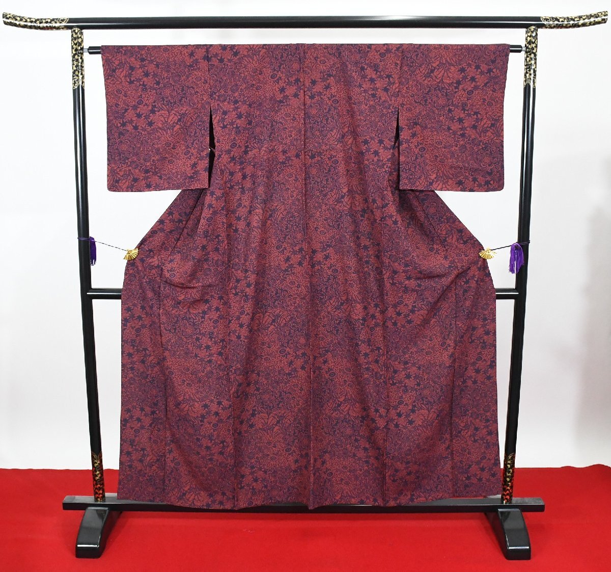 > 小紋 着物 単衣 楓 草花 化繊 身丈151cm 裄丈63cm ★ kb-6803 桜庭呉服店