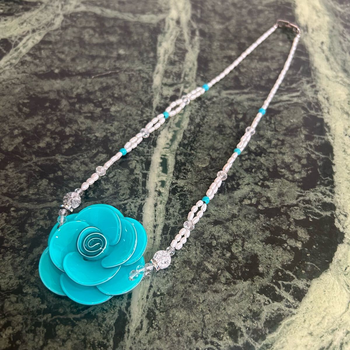 - 【新品】薔薇デザインペンダント★淡水パール 水色 白 ネックレス アクセサリー バラ エレガント