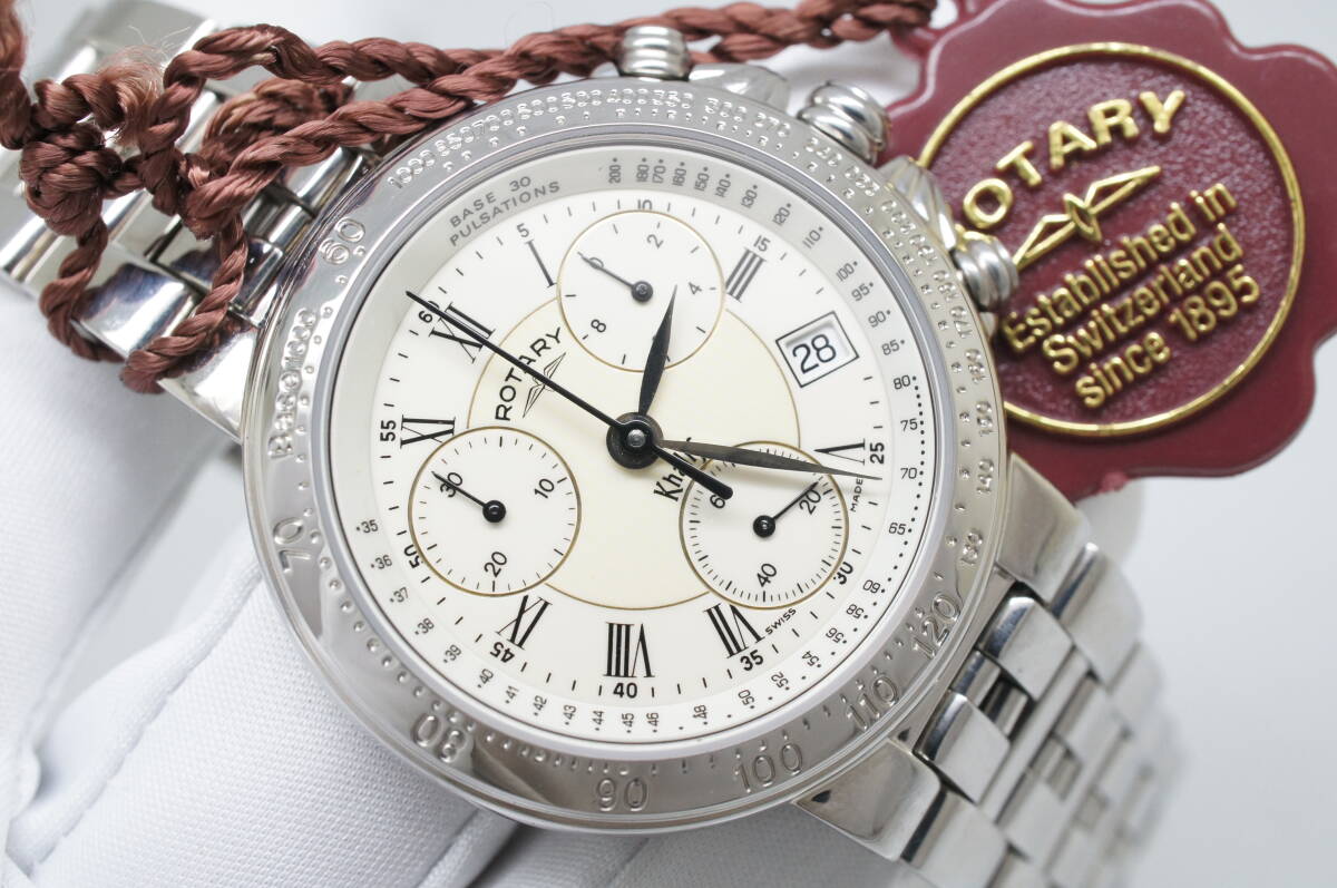 > D147●作動良好 未使用デッドストック ROTARY ロータリー クロノグラフ アイボリー文字盤 タグ付 デイト メンズ腕時計 シルバー クォーツ
