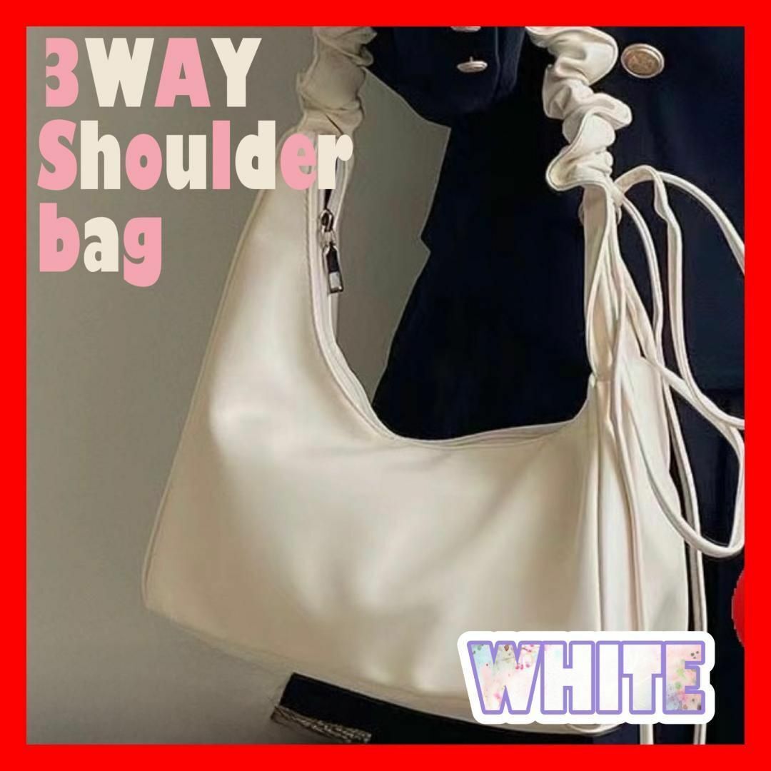 - ホワイト ギャザー ショルダーバッグ ショルダー バッグ リボン レザー かばん ハンドバッグ 肩掛け レディース シャーリング