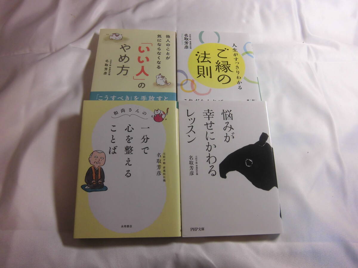 「和尚さんの 一分で心を整えることば」名取 芳彦(著) 2021年初版2022年7刷定価680円+税。と「他人のことが気にならなくなる いい人のやめ方」名取 芳彦 (著) 2020年初版定価680円+税。と「人生がすっきりわかるご縁の法則」名取 芳彦(著) 2022年初版2022年2刷定価792円+税。と「悩みが幸せにかわるレッスン 」名取 芳彦(著) 2016年初版定価620円+税。の計4冊セット。