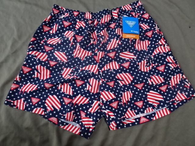 - USA購入 激レア【Columbia PFG】【OMNI SHADE】アメリカ星条旗柄 FISHイラスト インナーメッシュ付スイムパンツUS Sサイズ