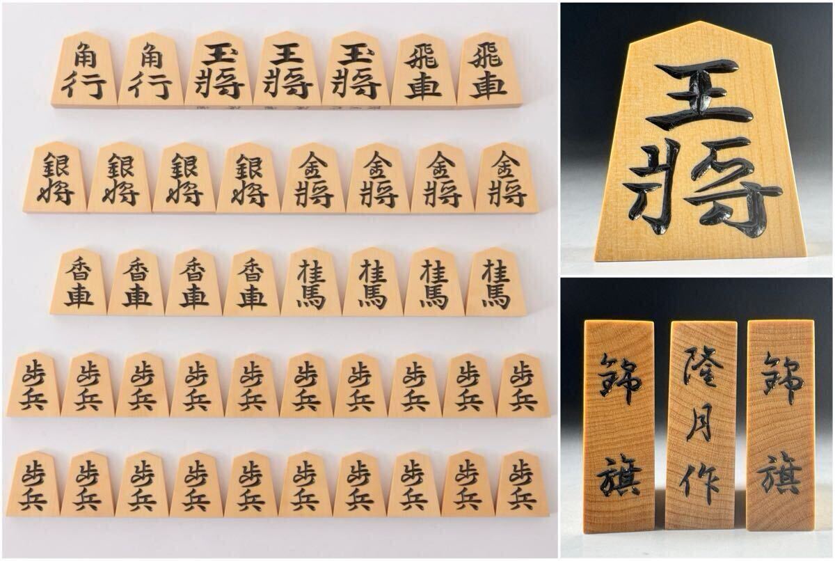 - #303 隆月 作 錦旗書 彫 将棋 駒 43点1組 共箱 仕覆 駒箱 駒袋 底部に刻銘「隆月作」「錦旗」