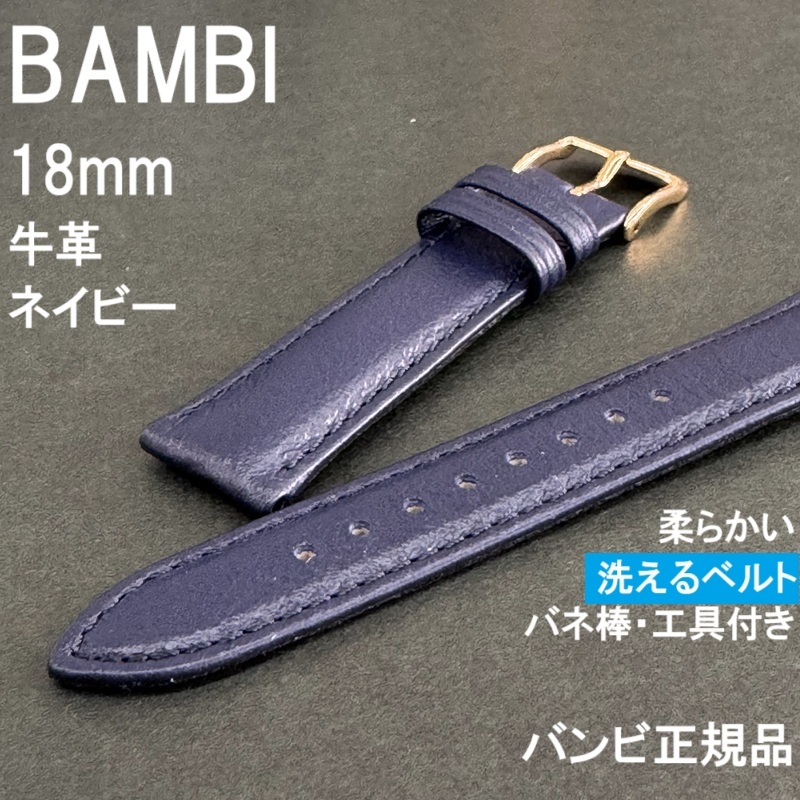- 送料無料★特価 新品★BAMBI 洗えるベルト 時計バンド 18mm 牛革 ネイビー 紺色★柔らかい! バネ棒&工具付き★バンビ正規品 定価6,600円