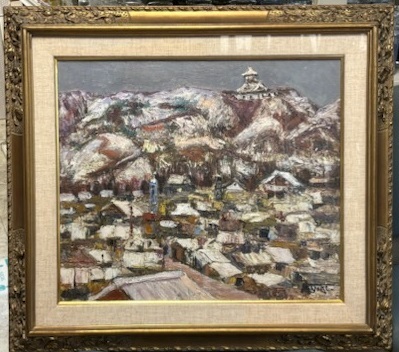 - 真作保証 油彩 八木茂雄 【雪の城下町】 郡上八幡城 日展会友 光風会会員 師:鬼頭鍋三郎