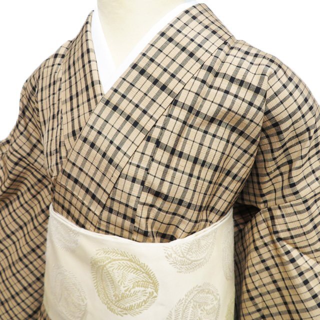 > 小紋 着物 中古 正絹 紬地 単衣 カジュアル 格子模様 薄茶色 黒色 身丈159.5cm 裄65cm M きもの北條 A1186-14