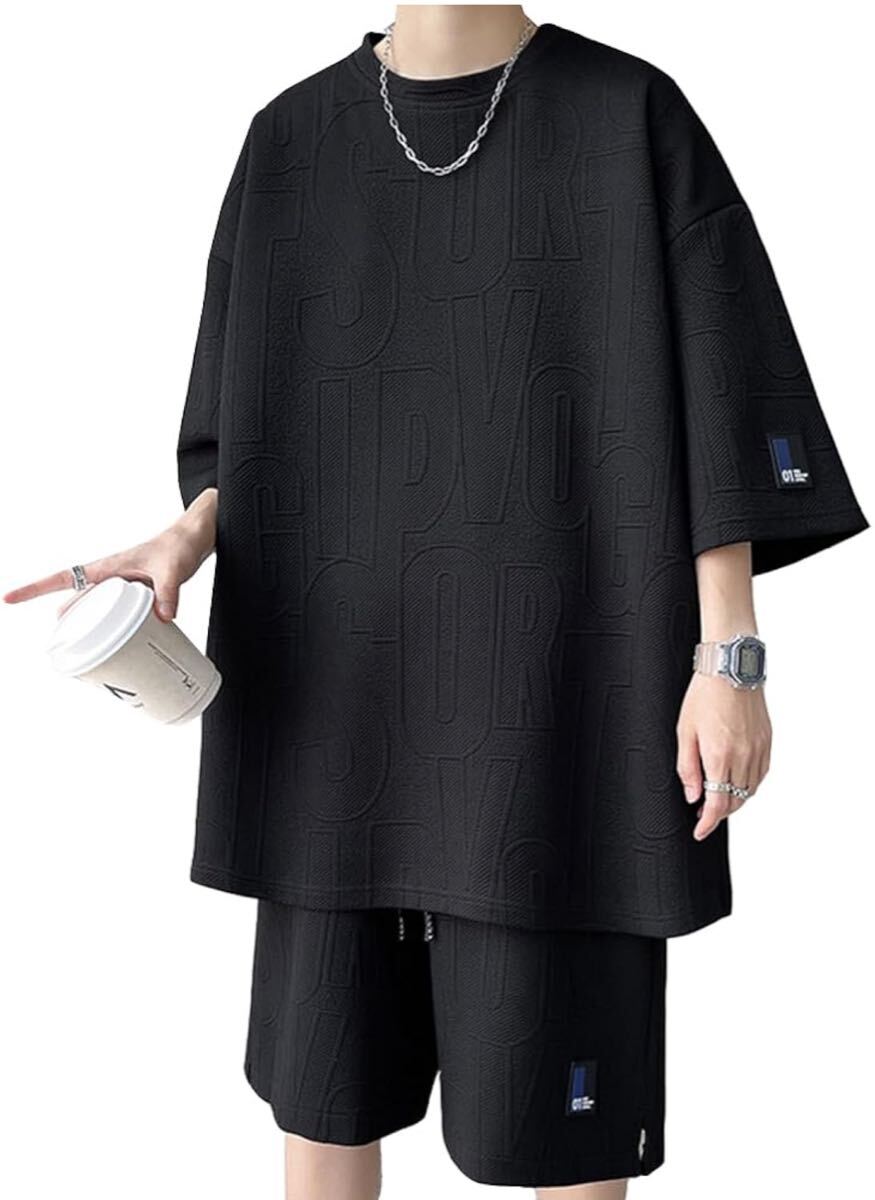 > 夏服 メンズ 上下セット Tシャツ 半袖 無地 大きいサイズ ゆったり おしゃれ 上下スウェット 服 トップス ハーフパンツサイズ: XL ブラック