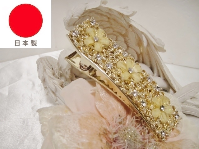 > ♪ 新品 日本製 Made in Japan Mバンスクリップ『高品質/3連フラワー/花/ロングサイズ/強力バネ入り/スワロフスキー/ラメパールMIX』♪