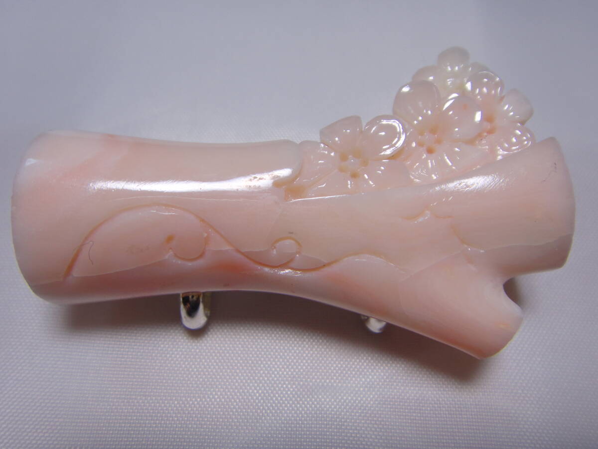 - 本珊瑚 本サンゴ コーラル 帯留め お花 彫刻 枝 肉厚 ヴィンテージ 昭和レトロ Y609