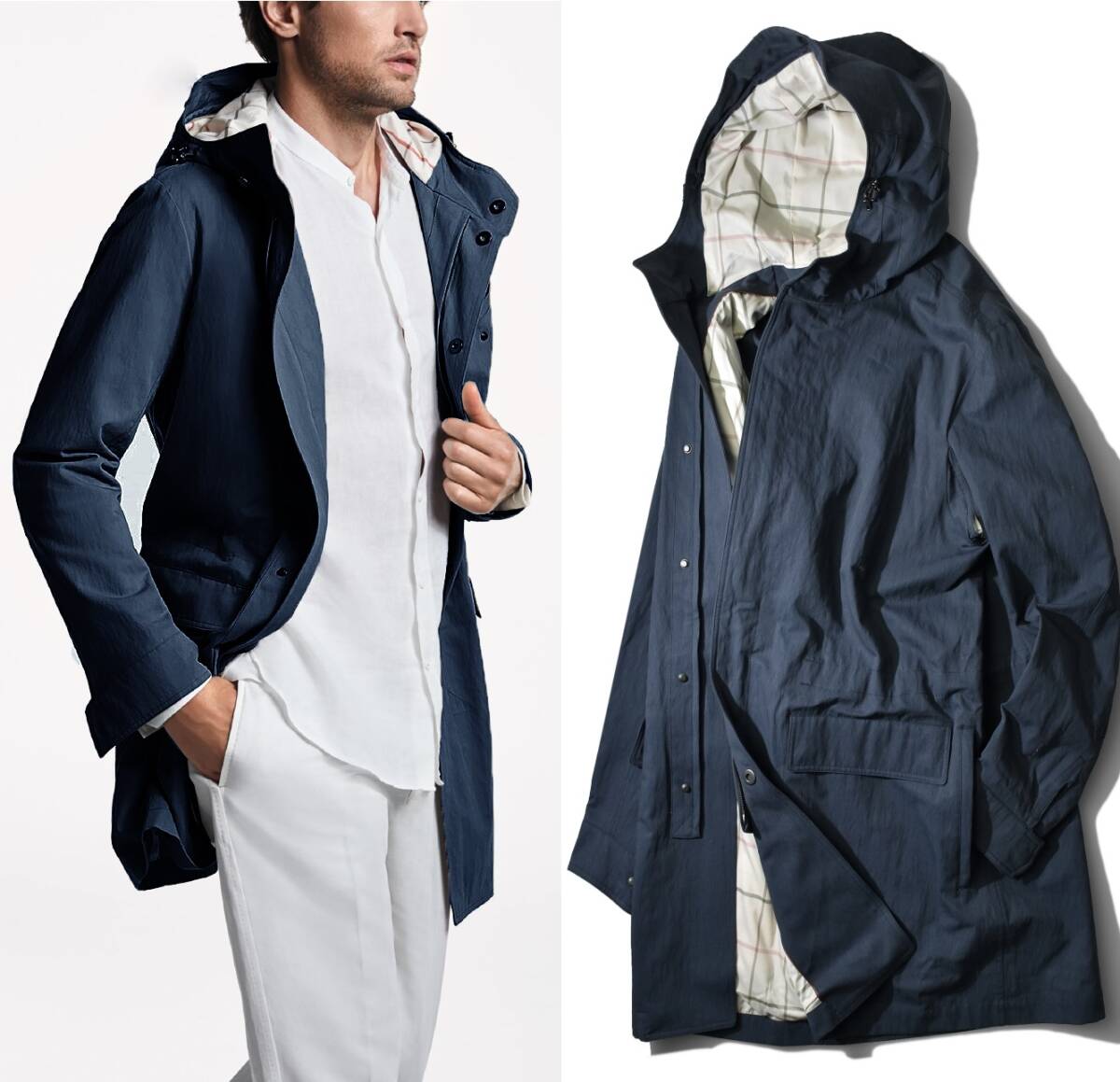 スポーツミックスなトレンドを端的に表現するフードの意匠が、インテリジェンスなミドル丈コートを軽快かつお茶目に昇華。