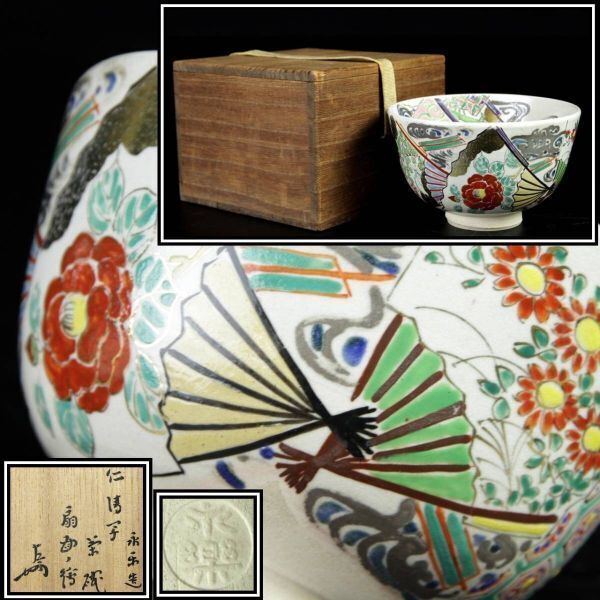 - 【爨】永楽善五郎造 仁清写 扇面の絵茶碗 即中斎書付 茶道具 唐物骨董 [F547A]Ug/20./(100)