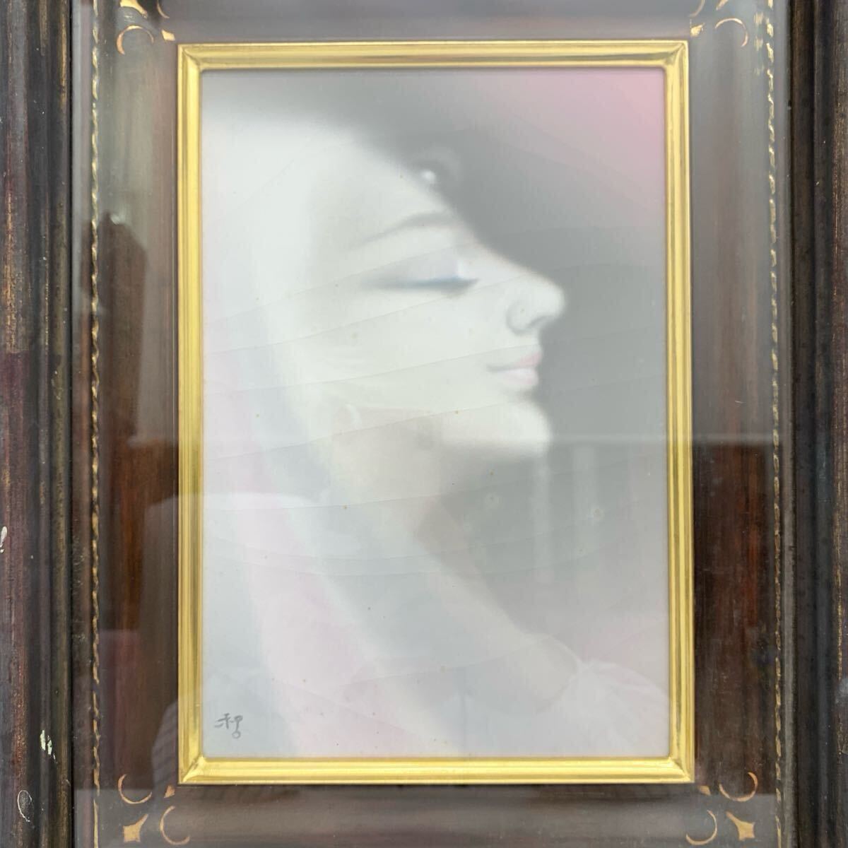 > 【真作】若尾和呂 「献心」 共シール 有り 1991年 油彩 絵 絵画 作品サイズ 24.5×16.5㎝ 額サイズ44×36.5㎝ 人物画 横顔 女性 '91 特2