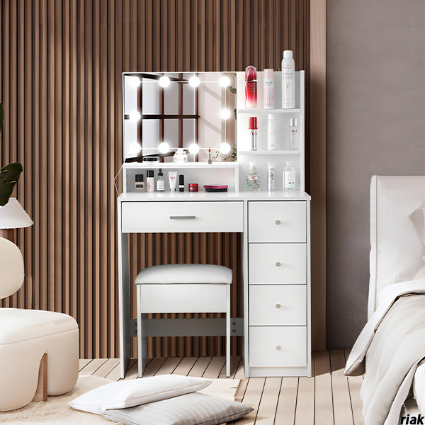 - 【理想的な照明環境でメイクやスキンケアが快適に行える】 ホワイト LEDライト付き 収納ドレッサー メイク台 おしゃれ 可愛い