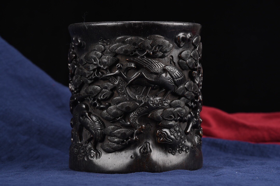 - 蔵友旧蔵出 烏木製 細密彫 鬆鶴延年紋 筆筒 置物 古賞物 稀少珍藏品 中国時代美術品
