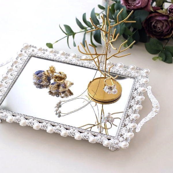 - ミラートレイ トレイ 鏡 おしゃれ アクセサリートレイ スクエア ミラースクエアハンドルトレー パール 送料無料(一部地域除く) vin3331