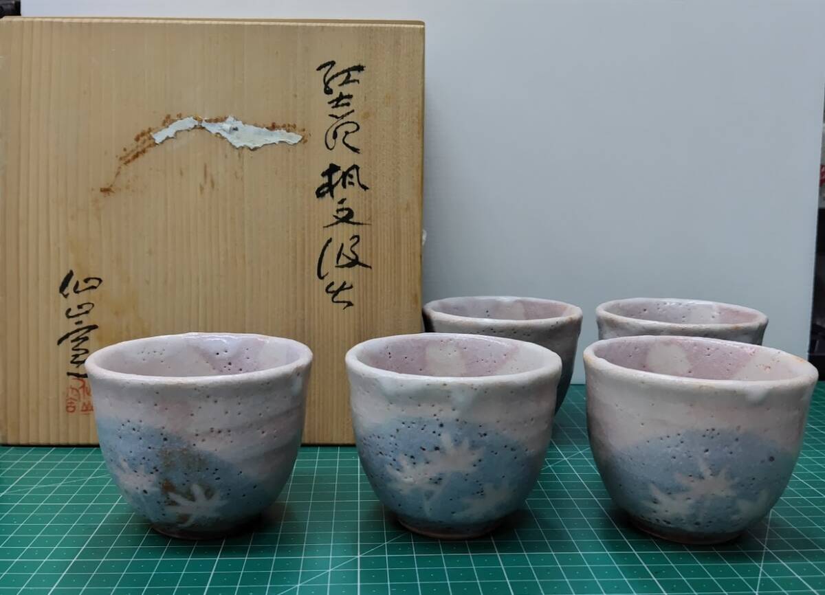 - 美濃焼 仙山窯 紅志野楓文汲出 茶碗 5客揃 安藤日出武 安藤工 湯呑●H4909