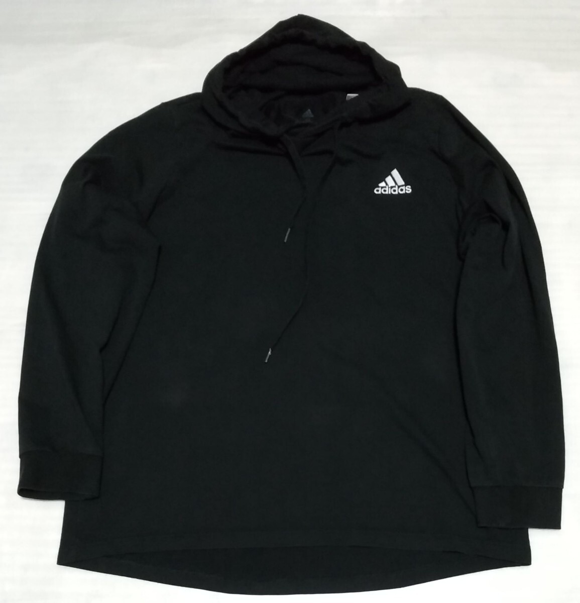 > ☆adidas.com サイズXLジャパン4XO パーカー(フード付長袖Tシャツ)スポーツ黒色ブラック刺繍白ウェアTEEフーディー洗濯済ティー アディダス