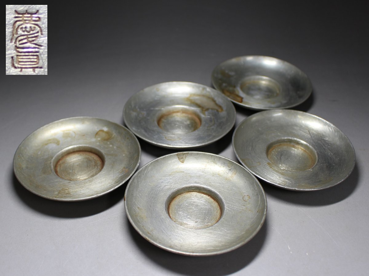 - ◆古錫・慶真・円式・茶托・5客・底款・在印・重さ250㌘◆a6141h