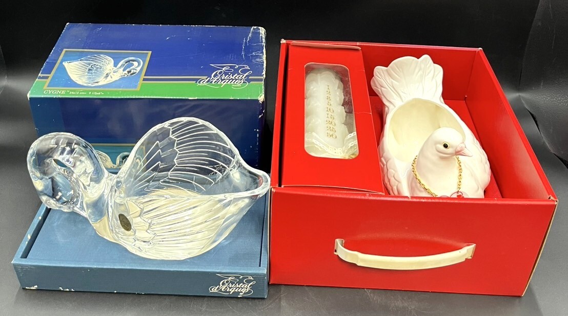 - 【R742】Cristal D'Arques/クリスタルダルク/クリスタル/ガラス製/スワン/小物入れ/キャンドル&フラワーポット/白鳩/ハト/陶器/2点セット