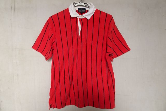> Spice Island/半袖ラガーシャツ/やや厚手生地/黒ストライプ柄/襟布帛素材/裾サイドスリット/赤/レッド/Mサイズ(5/13R7)