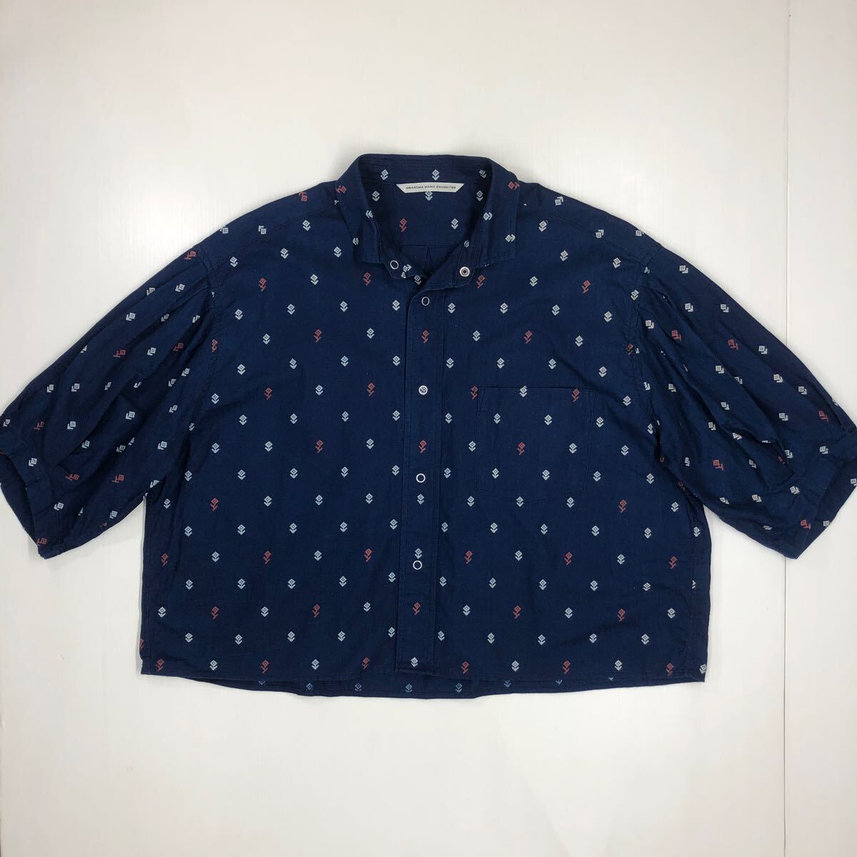 > GRANDMA MAMA DAUGHTER グランマママドーター 半袖シャツ 麻混 トップス ショルダーダウン ネイビー レディース サイズ1 45-38