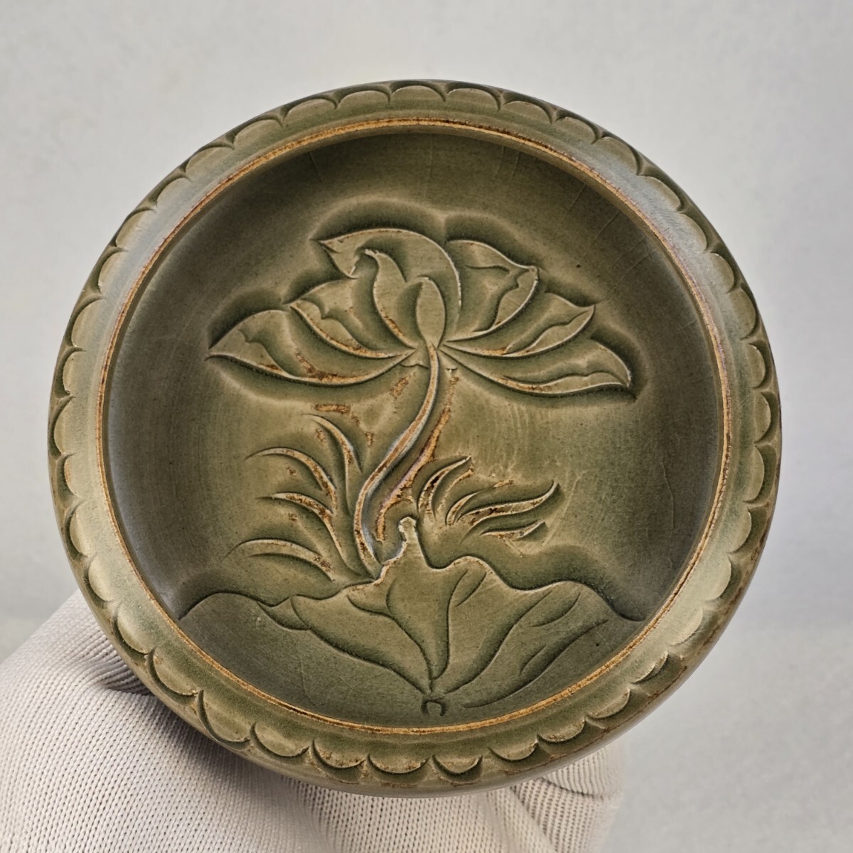 - 古文房具 中国古磁 耀州磁 柴窯 青磁 釉下手彫花 筆洗 墨池 筆添 小皿