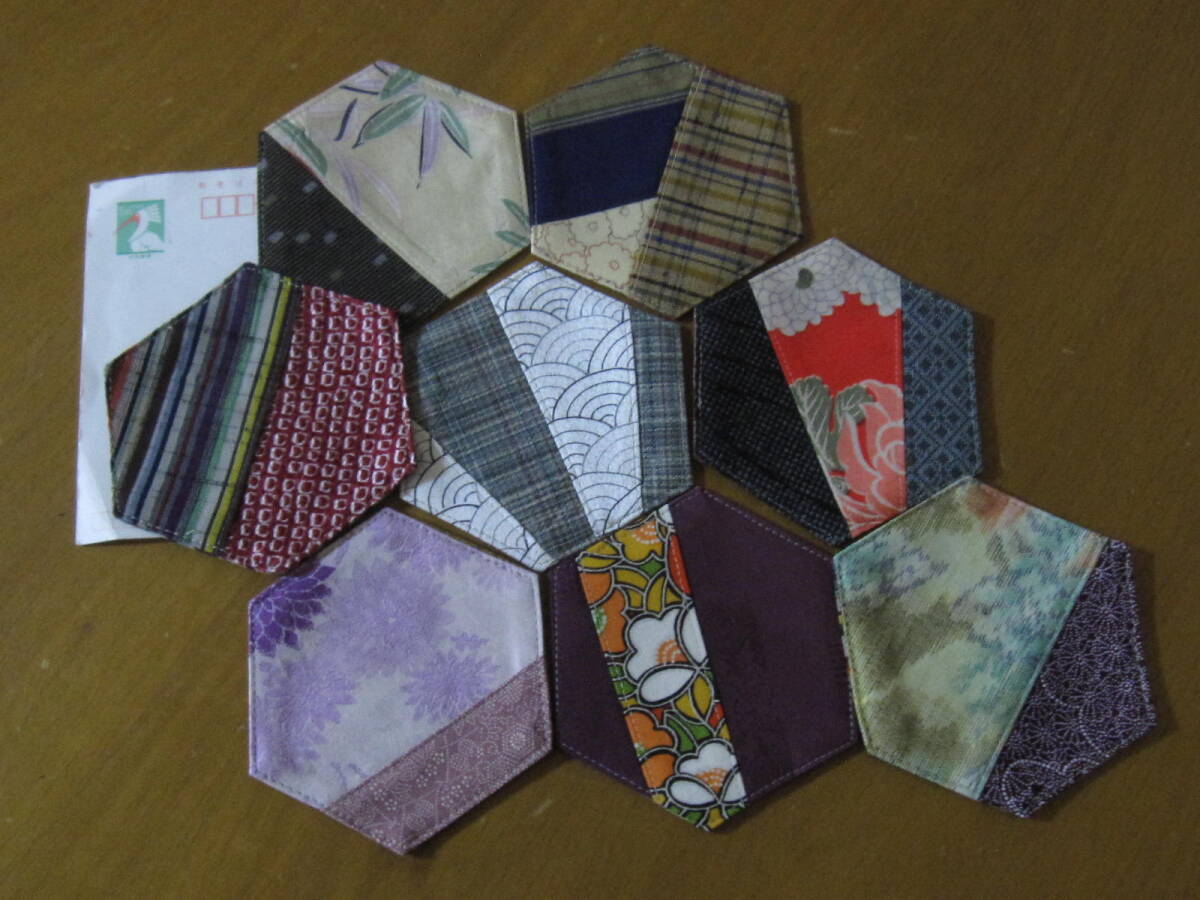 - 手作り 六角 コースター 着物リメイク 8枚 パッチ リバーシブル 花 模様 ライン 紬絣絞 レトロ 兼用 セット まとめて ハンドメイド 可愛 B