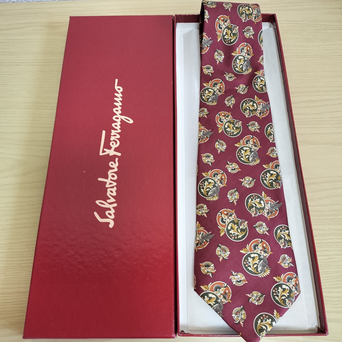 - Salvatore Ferragamo(サルヴァトーレフェラガモ)赤生き物丸葉っぱ模様ネクタイ