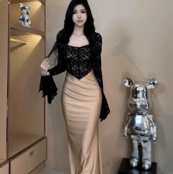 - 新入荷人気推薦キャバクラドレス 長袖 レース ロングワンピース セクシー レディース S ブラック