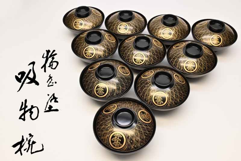 - 能登輪島 大極上本堅地■布着 沈金 吸物椀 家紋[左三階松]椀 十客■山口清松造り 天然木 時代漆器 茶道具 懐石 料亭 和紙袋 木箱入り■