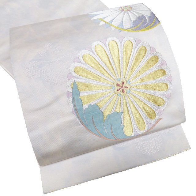 - 袋帯 中古 リサイクル 正絹 フォーマル 仕立て上がり 六通 菊と松模様 箔糸 灰白色 多色 金銀 きもの北條 A1193-13