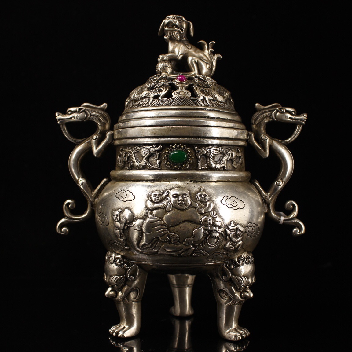 - 【超珍館蔵】銅製 銀鍍 寶石嵌 雙龍耳 獅子熏香炉 置物 賞物 古賞物 古美術品 稀少珍蔵品