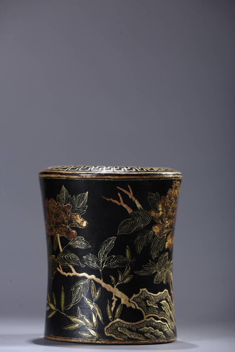 - 蔵友旧蔵出 木胎漆器彫 描真金 牡丹花卉紋 筆筒 貴重物品 置物 賞物 中国時代美術品