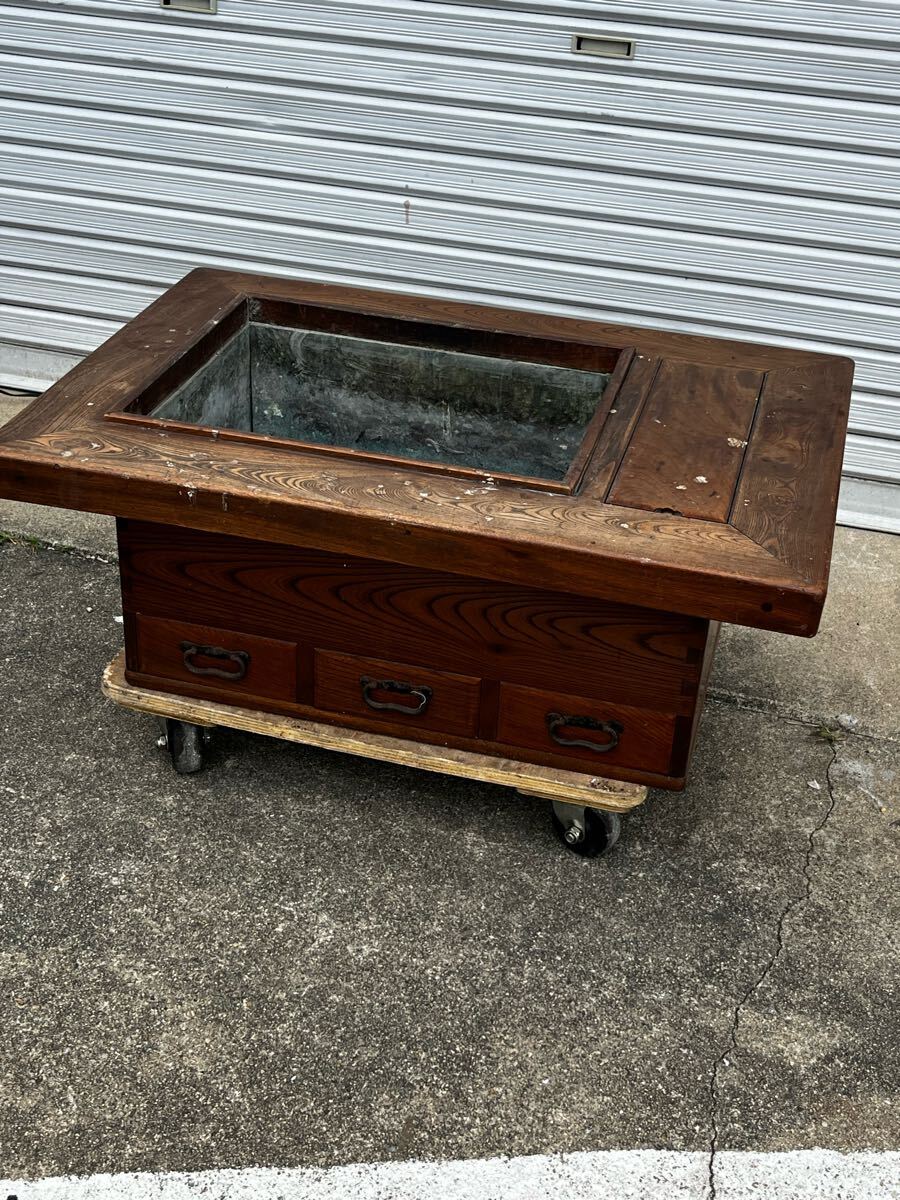 - 囲炉裏座卓 欅けやき 天然木 無垢材 囲炉裏 座敷机 火鉢 レトロ ジャンク インテリア アンティーク 古道具 茶道具 骨董 囲炉裏 長火鉢