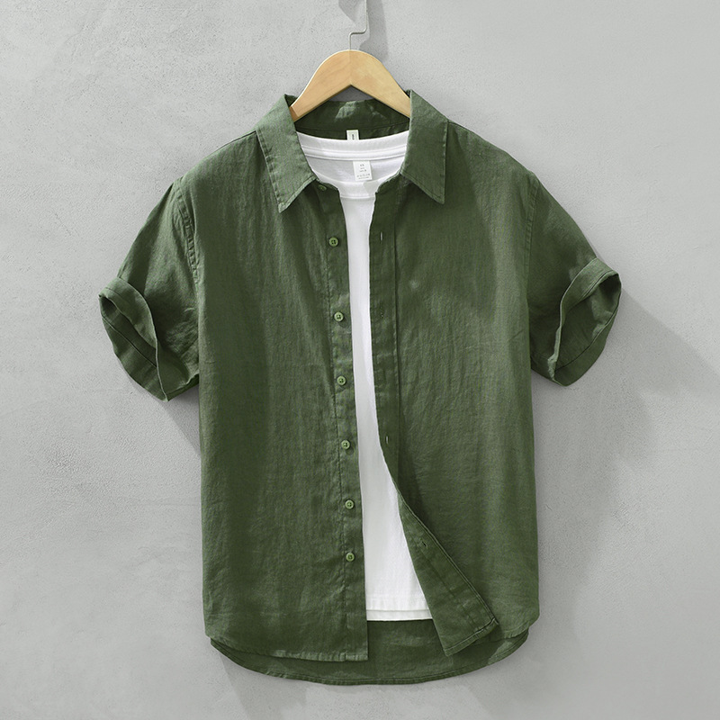 - 新入荷リネンシャツ 半袖シャツ メンズ 無地 リネン100% 麻シャツ カジュアルシャツ トップス 心地良し 爽やか 快適 涼しい グリーン L4色