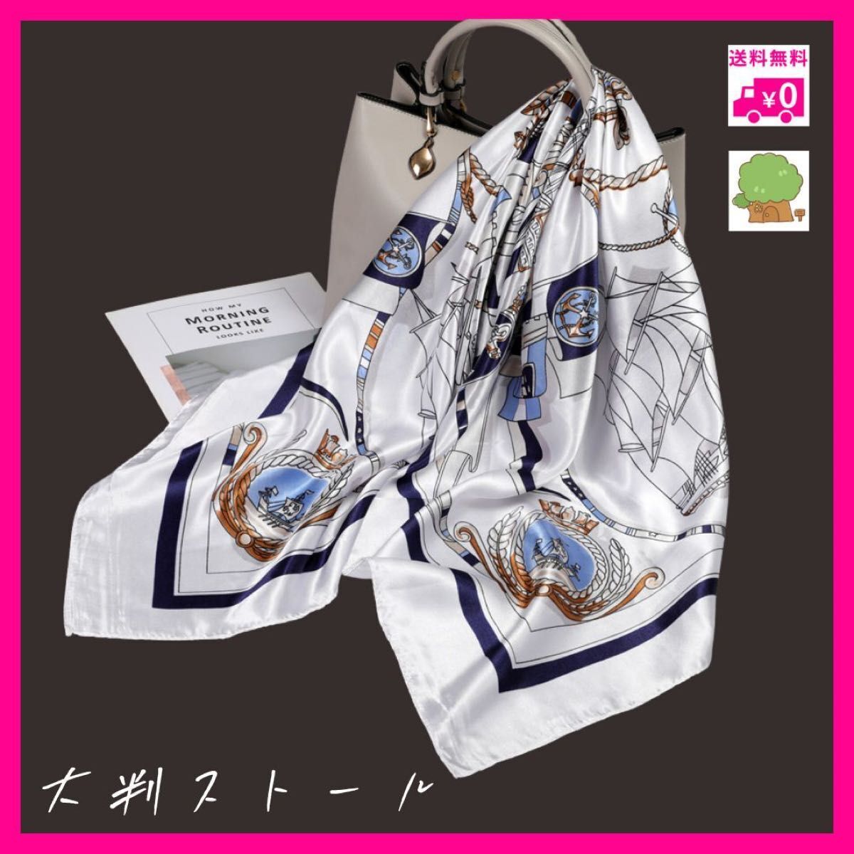 - 大判スカーフ ショール 帆船 マリン エレガント 90cm×90cm ホワイト ブルー ストール 総柄 おしゃれ 海 日除