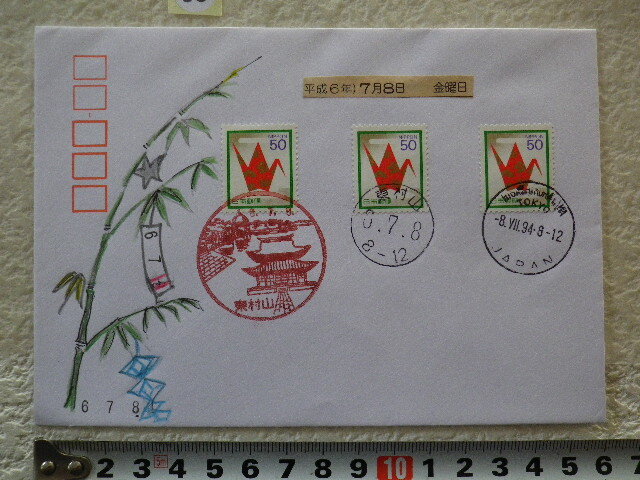 - 連番消印 678 3貼3消 東村山印 色鉛筆の肉筆カシェ④●58●同梱大歓迎